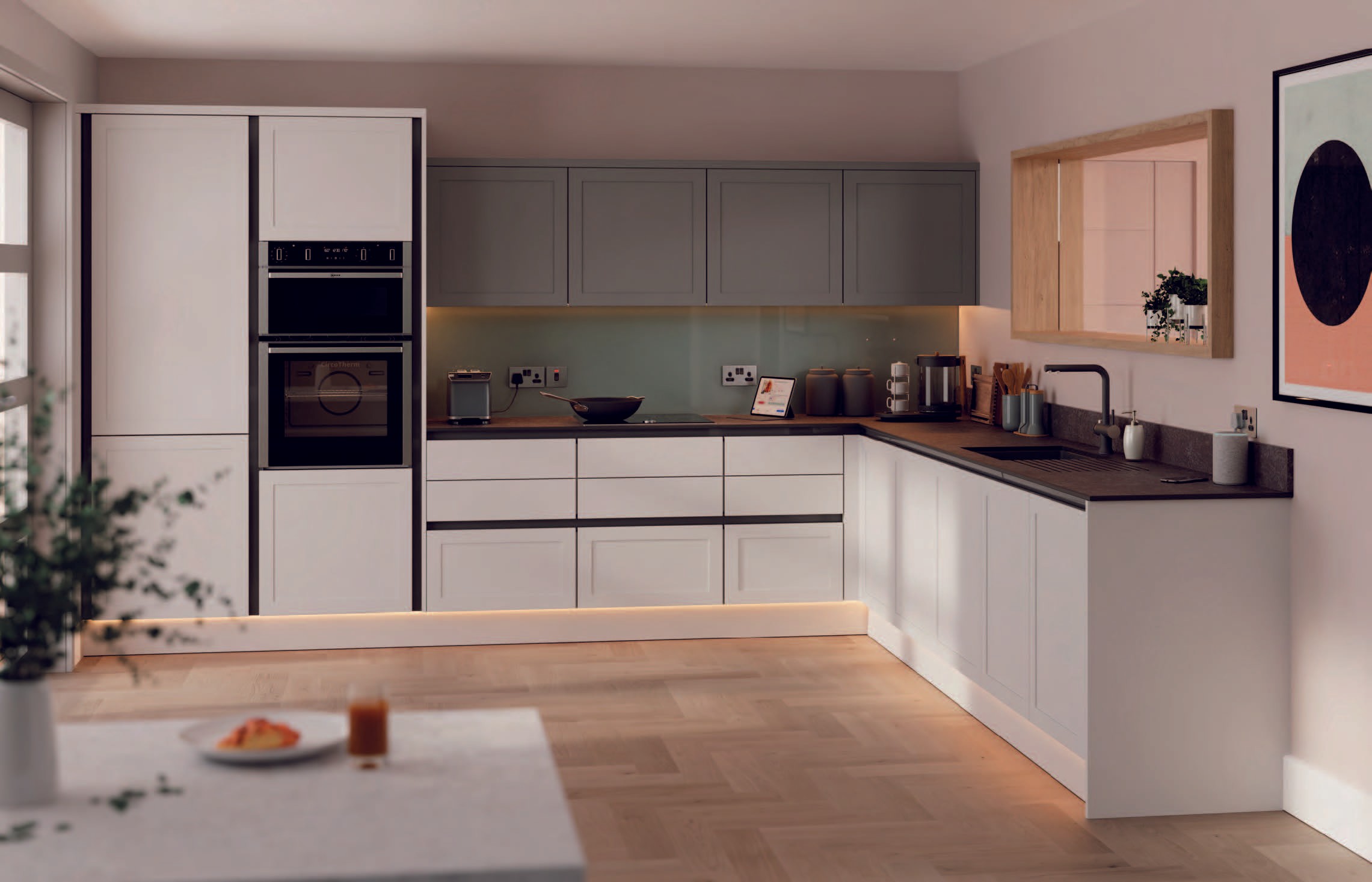 Strong horizontal and vertical lines – Aligned cabinet reveals, continuous plinths, stacked tiles emphasise order