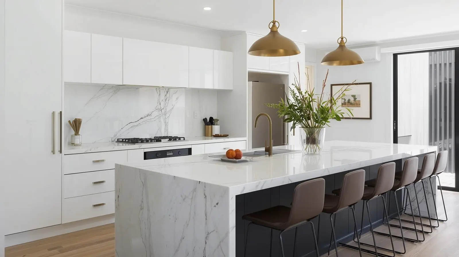 Flat-front cabinetry, integrated handles, warm neutrals, and surfaces kept clear. Minimalist design is about reducing visual clutter while maximising function.