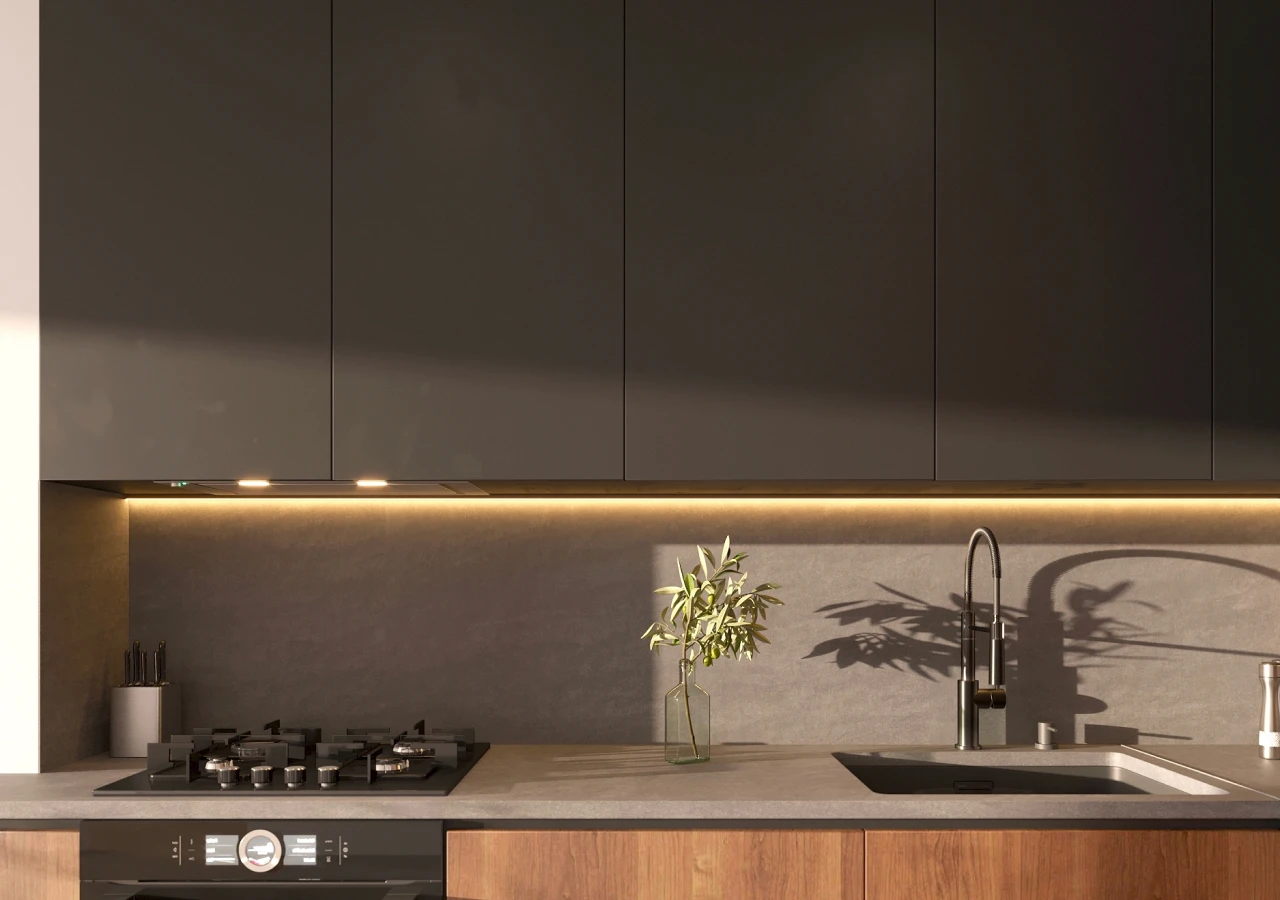 Dark anchors – Charcoal, deep navy, or black work best as 10–30% accent (island, hardware, slim frames) rather than dominating every surface
