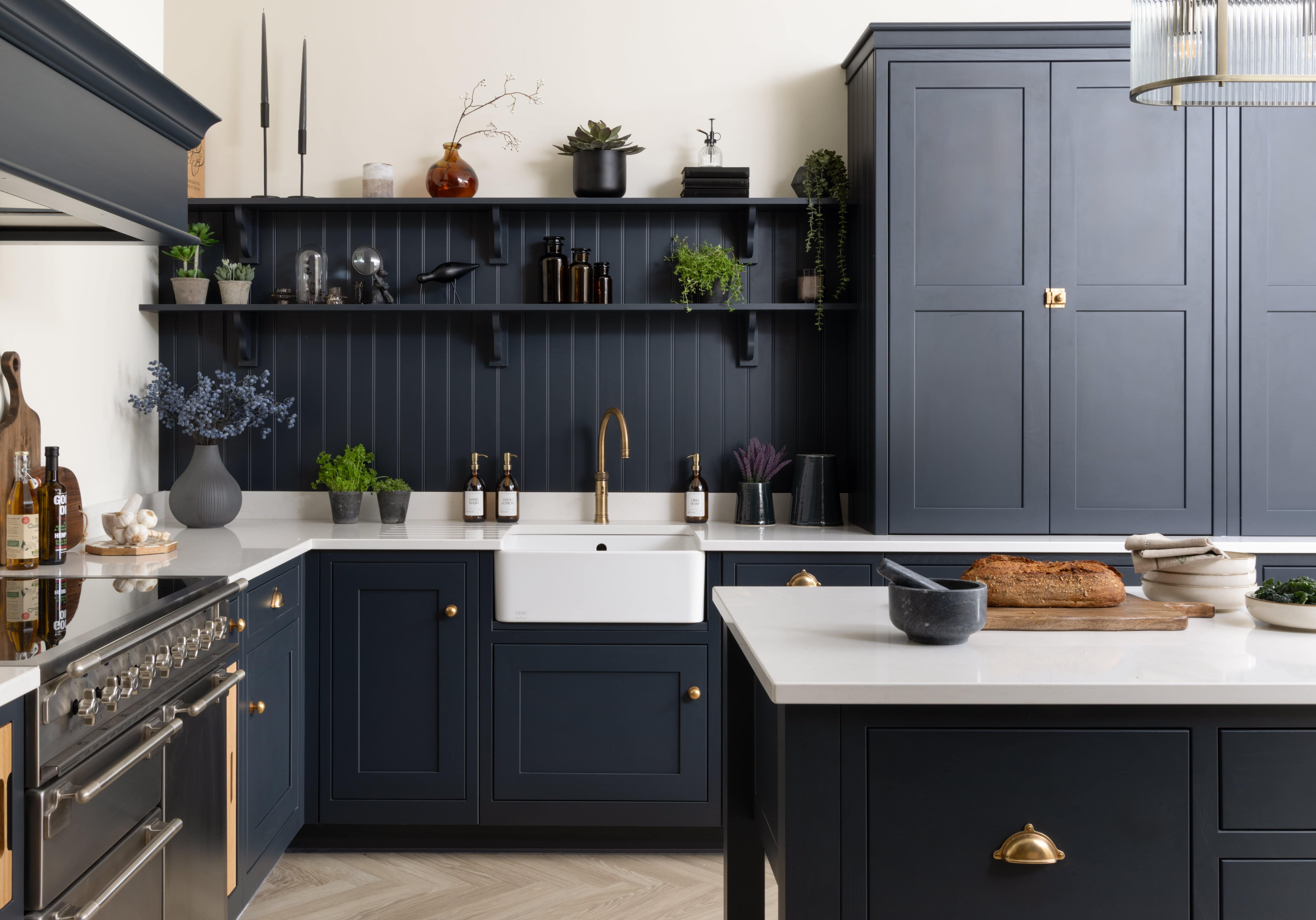 Shaker or raised-panel cabinetry in painted finishes. Solid wood or honed stone worktops. Metro tiles or classic patterns. Farmhouse sinks, range cookers, and warm brass hardware.