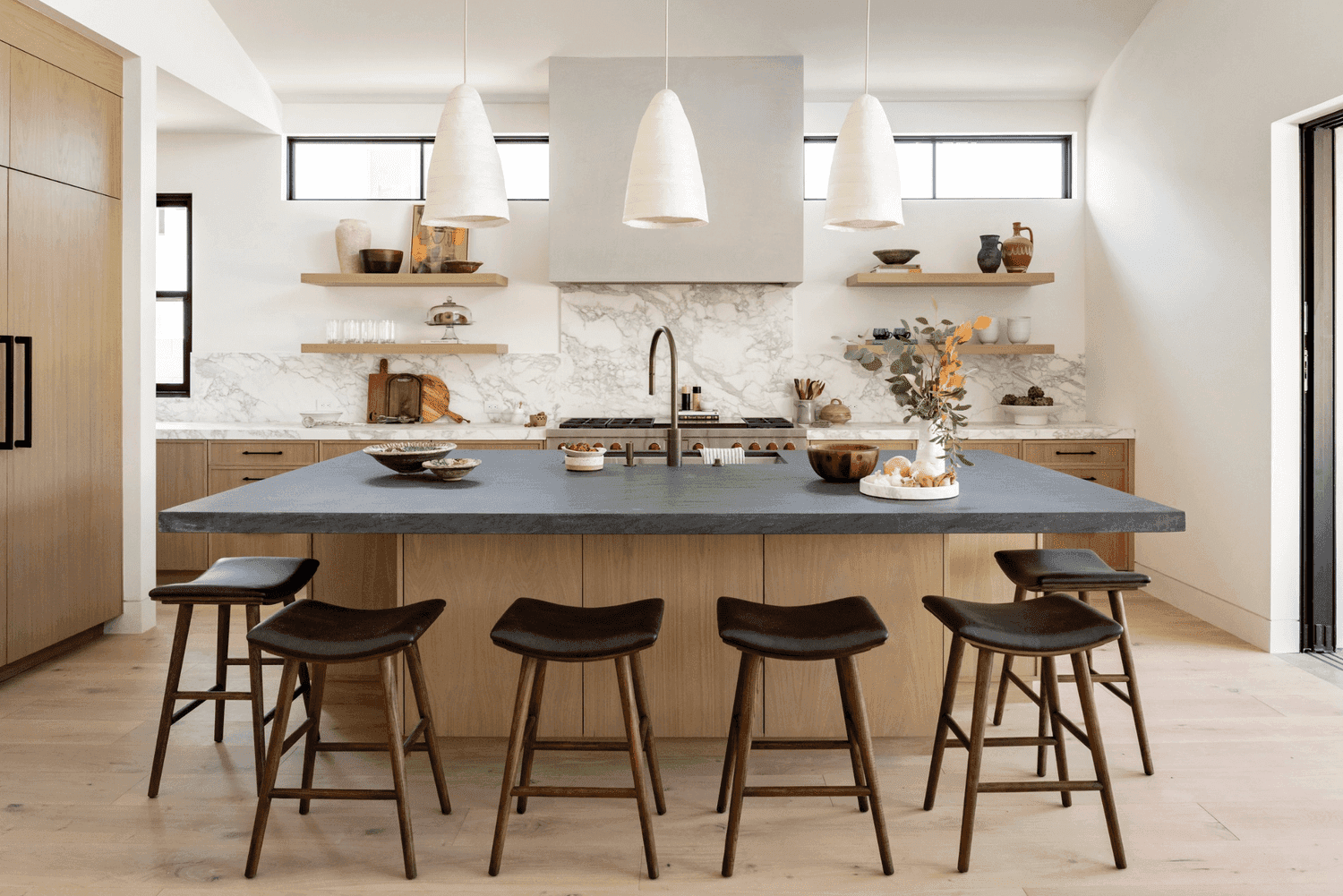 Natural stone – marble (Carrara or Calacatta) and granite. Marble gives old-world patina and classic luxury but is softer, porous, prone to etching and staining – better for islands than hard-working prep zones. Granite is tougher, more stain-resistant, practical for busy family kitchens.