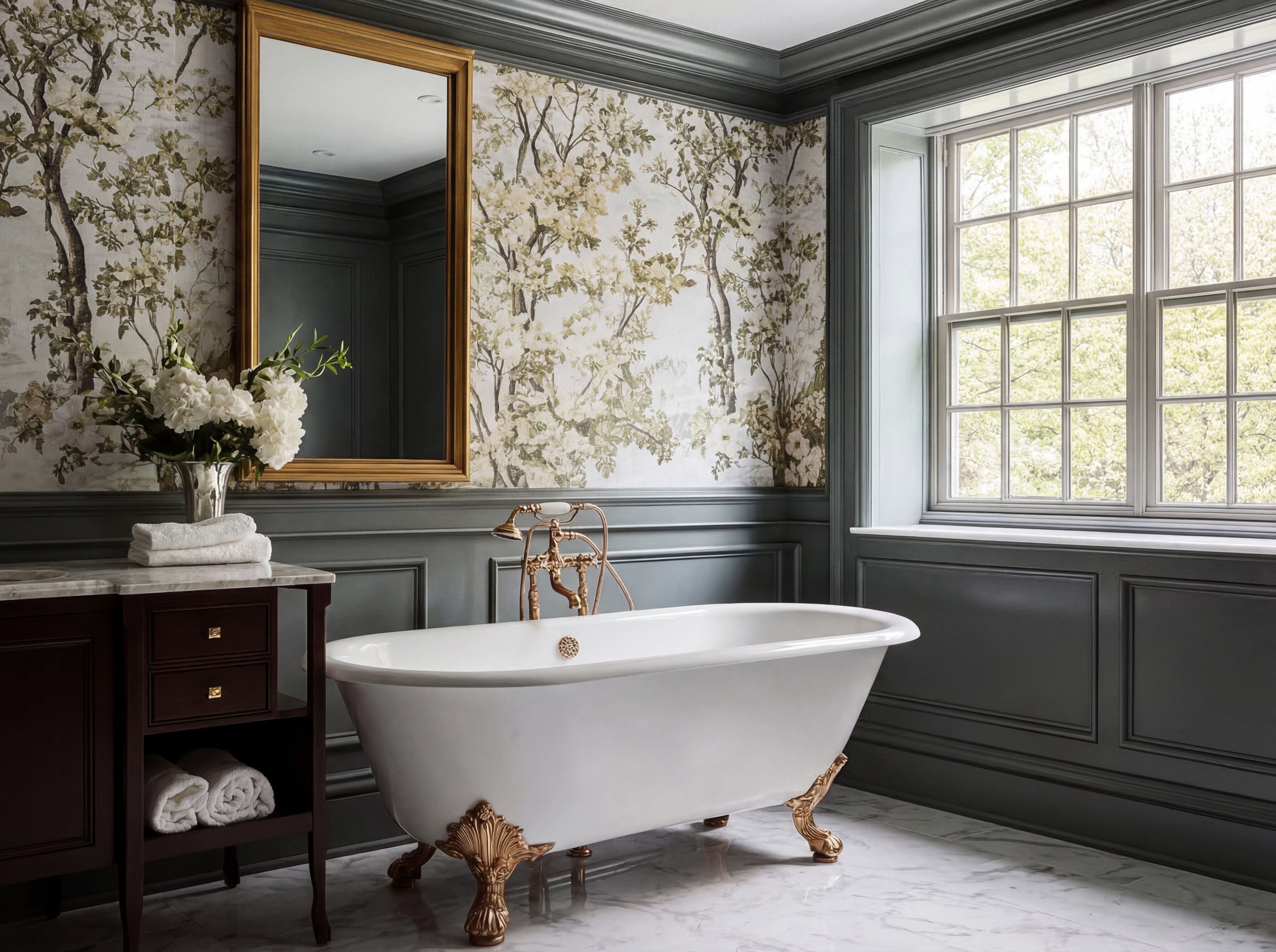 Victorian mood – Deep burgundy, maroon, navy, forest green, black and dark browns with white sanitaryware