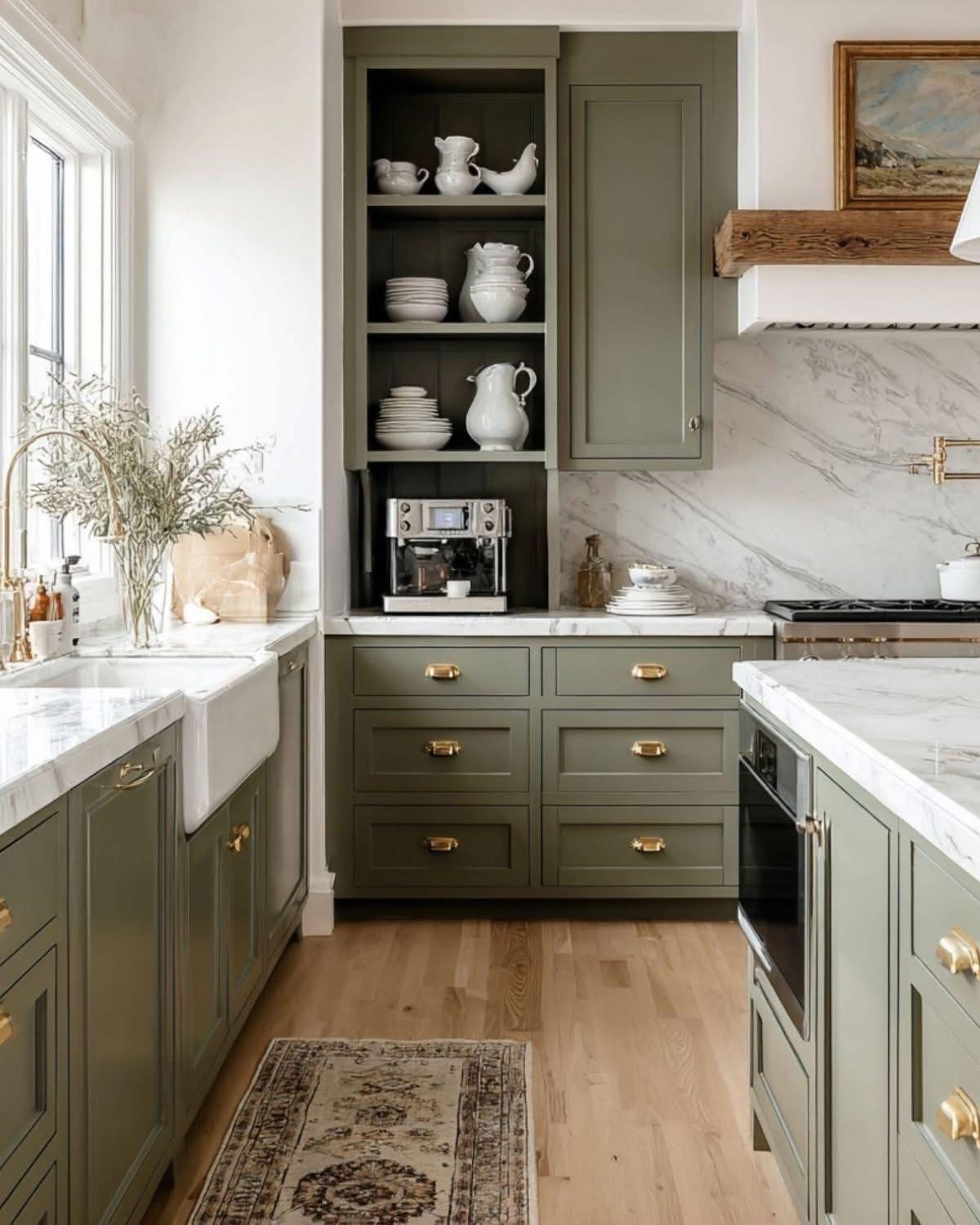 Warm country: Sage or olive green cabinets + warm white trim + wood tops/floor + cream metros