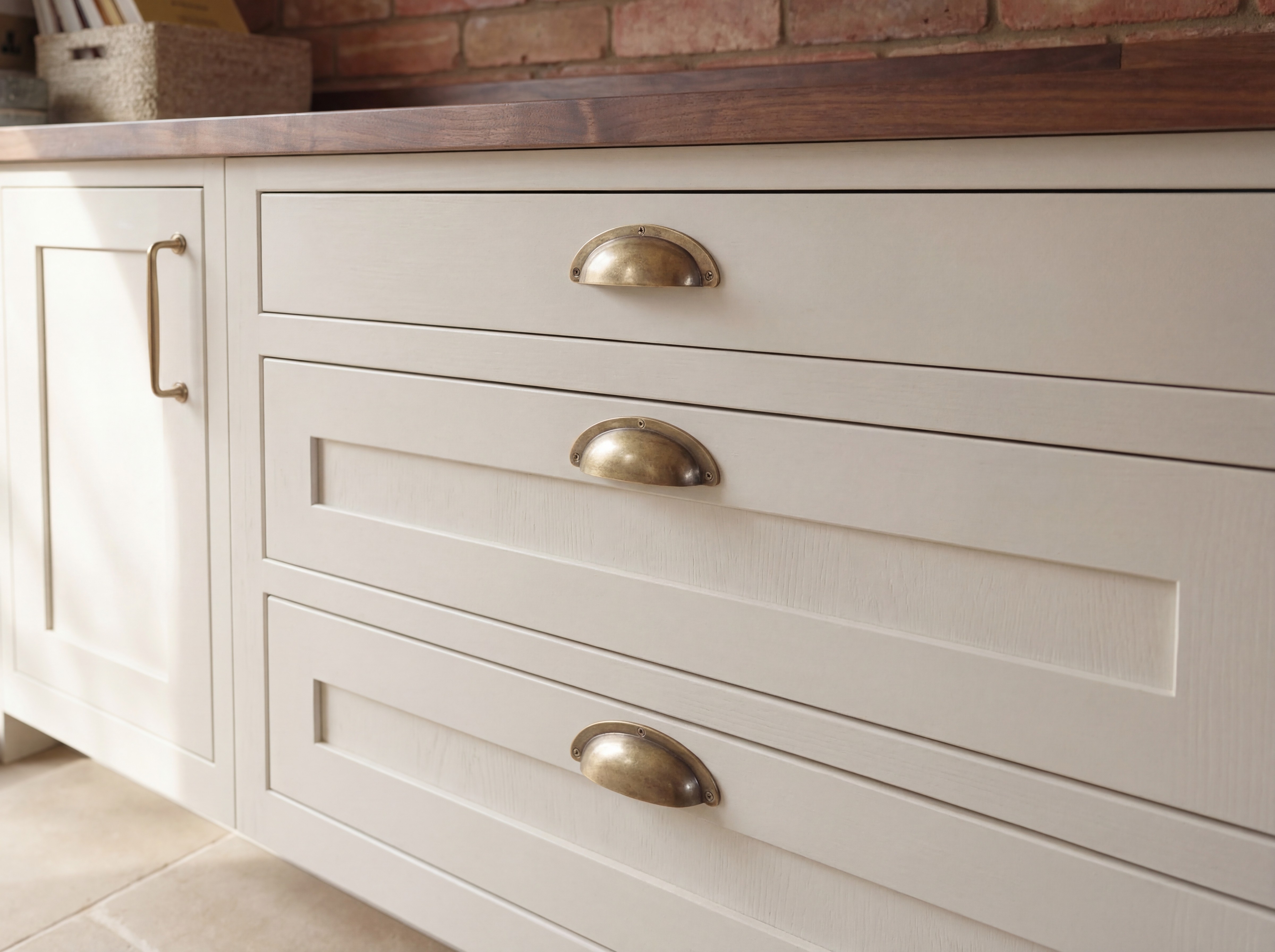 Traditional hardware sells the classic feel – solid metal knobs and cup pulls in warm finishes with tactile, heritage shapes.